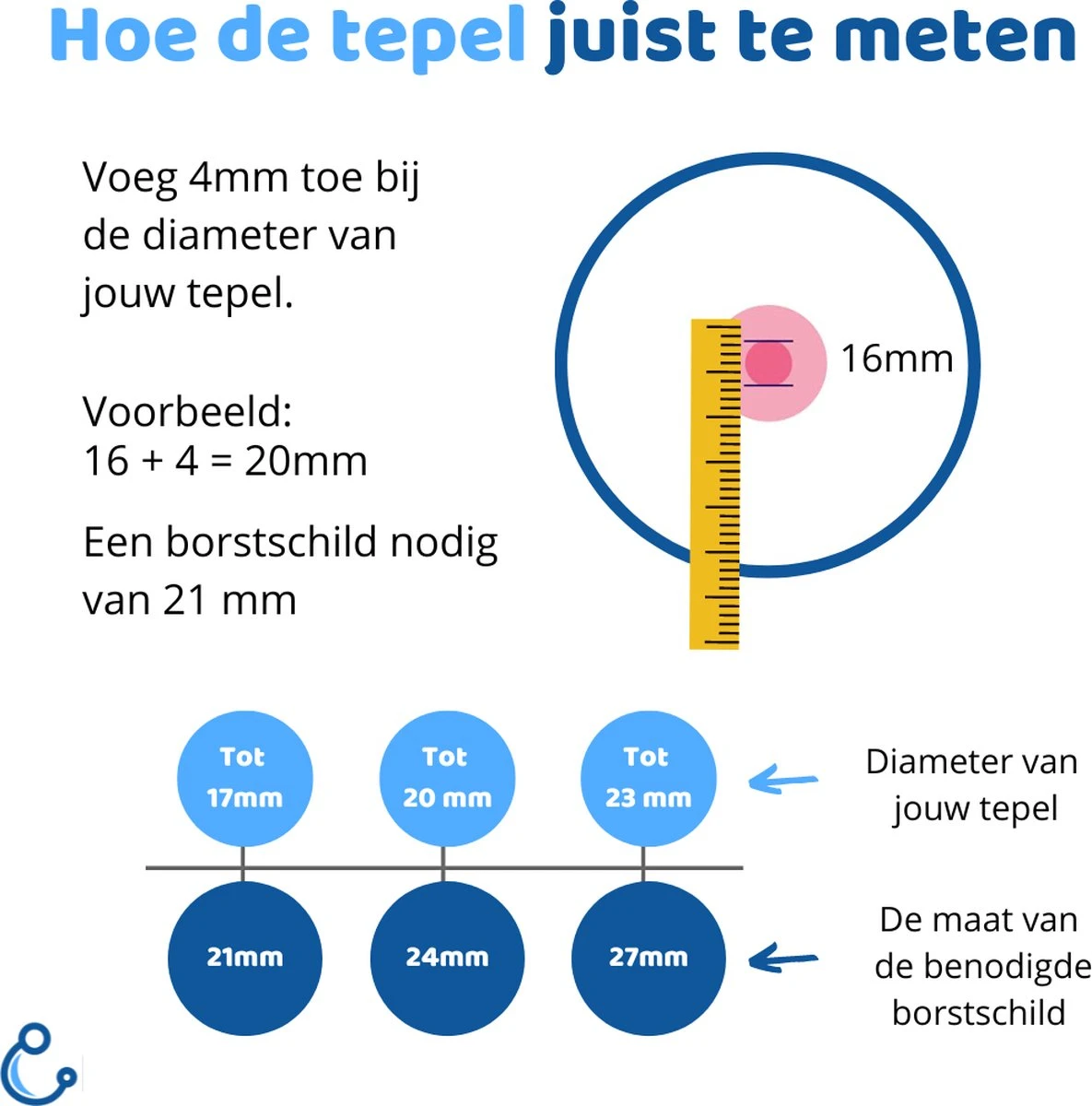 Lors de l’achat, vous recevrez plusieurs tailles de téterelles dans la boîte, à savoir la21mm, 24mm & 27mm † De cette façon, vous pouvez découvrir par vous-même quelle taille vous convient le mieux et vous n’avez pas à vous soucier de savoir si ce stock est la bonne taille voor jou . Mais comment savoir avec certitude quelle taille est la bonne ? Aux Nederland , 24 mm est la taille standard. Il est sage de mesurer votre mamelon pour connaître la bonne taille de téterelle. Mesurez le diamètre/diamètre de votre mamelon (pas l’aréole). Ajoutez 4 mm supplémentaires au résultat. Le mamelon va gonfler un peu pendant le pompage.