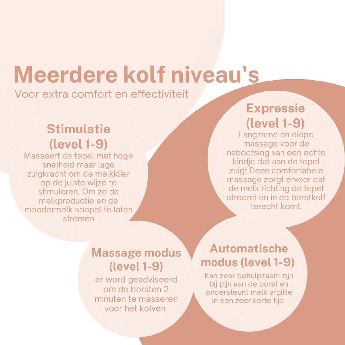 Ce tire-lait est équipé de 9 forces d’aspiration réglables, vous pouvez donc choisir la force parfaite pour votre confort pendant l’expression. En conséquence, il y a toujours un cadre agréable et avec lequel vous pouvez vous exprimer calmement et à l’aise. Cette flexibilité d’aspiration permet au tire-lait de s’adapter à vos besoins et offre une expérience de pompage confortable et efficace.
