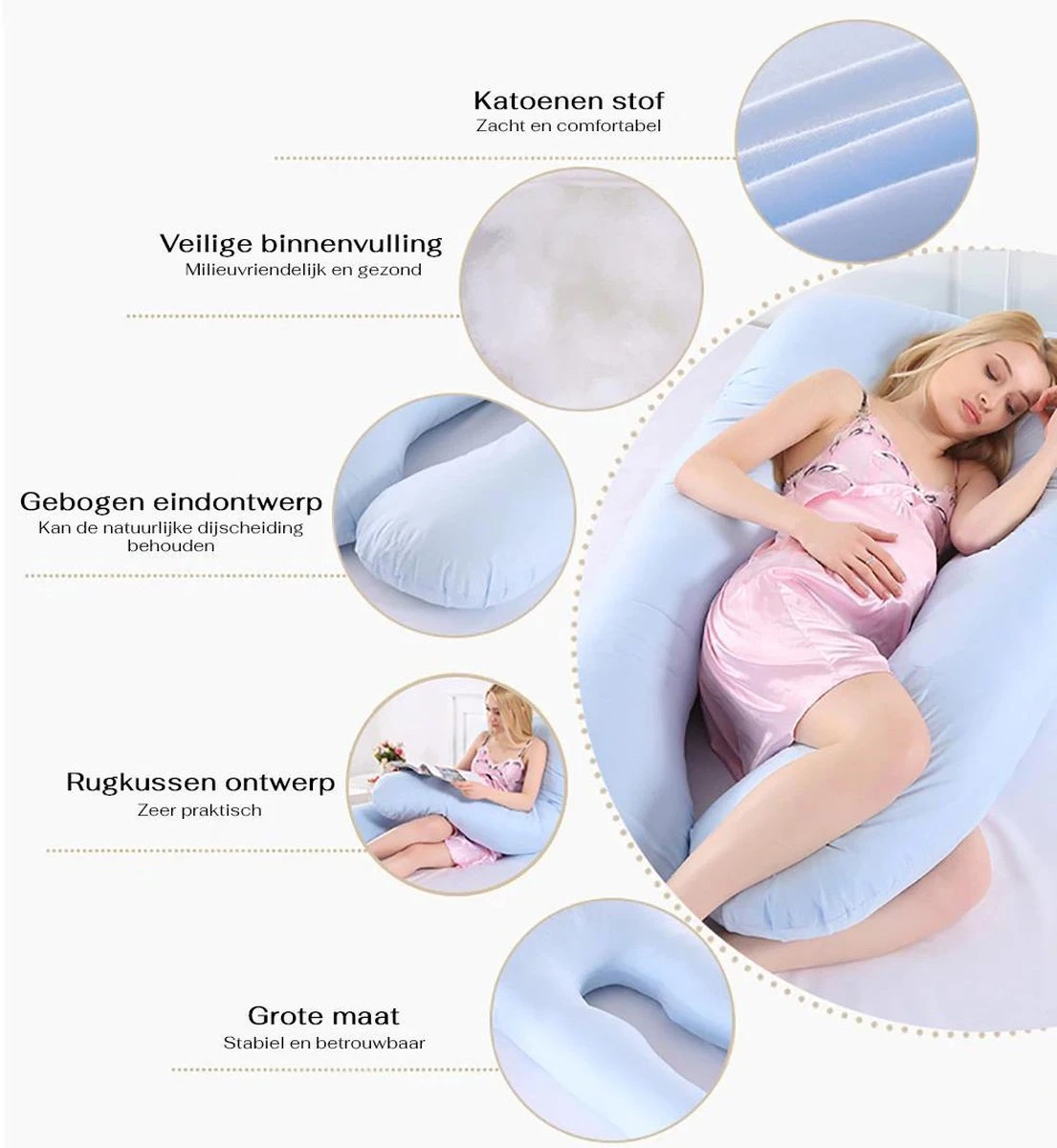 Gardez une bonne nuit de sommeil, même pendant la grossesse, grâce à ce fin oreiller en forme de U. Pour toute personne qui aime dormir de son côté. Fabriqué dans un matériau doux et confortable. A utiliser de différentes manières. Pour coucher, mais aussi pour élever votre enfant ou pour vous asseoir contre lui.